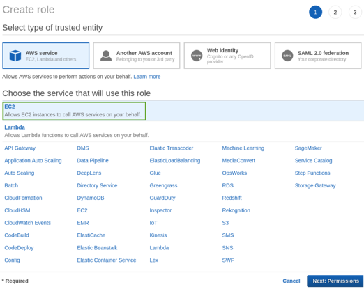 Create an IAM role by selecting the EC2 instance: