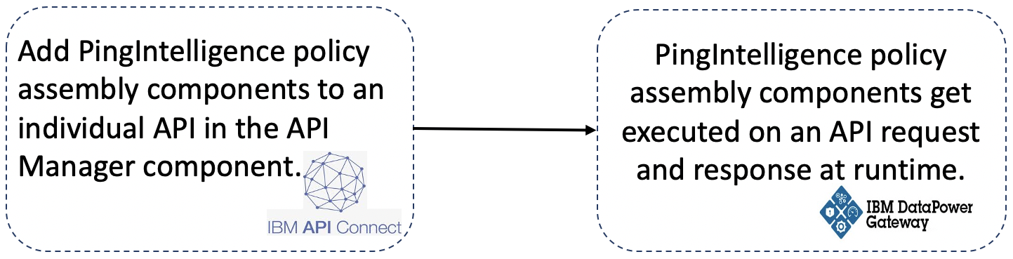 The PingIntelligence policy assembly components are added using API Manager in IBM API Connect. The following diagram shows the implementation steps of the PingIntelligence policy assembly components in the IBM API ecosystem.